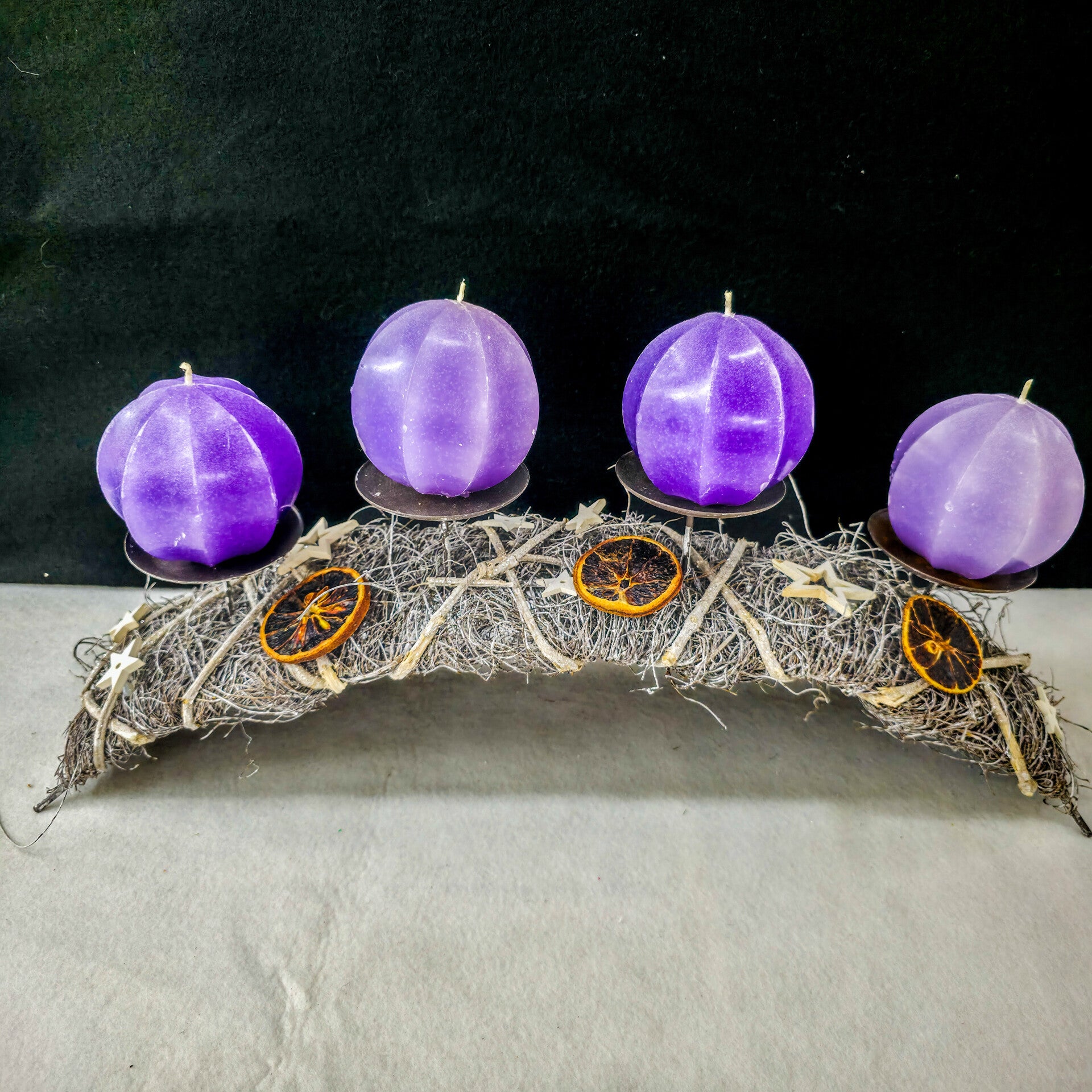 Ein moderner Adventskranz in sanftem Violett – elegant, ruhig und zugleich außergewöhnlich.