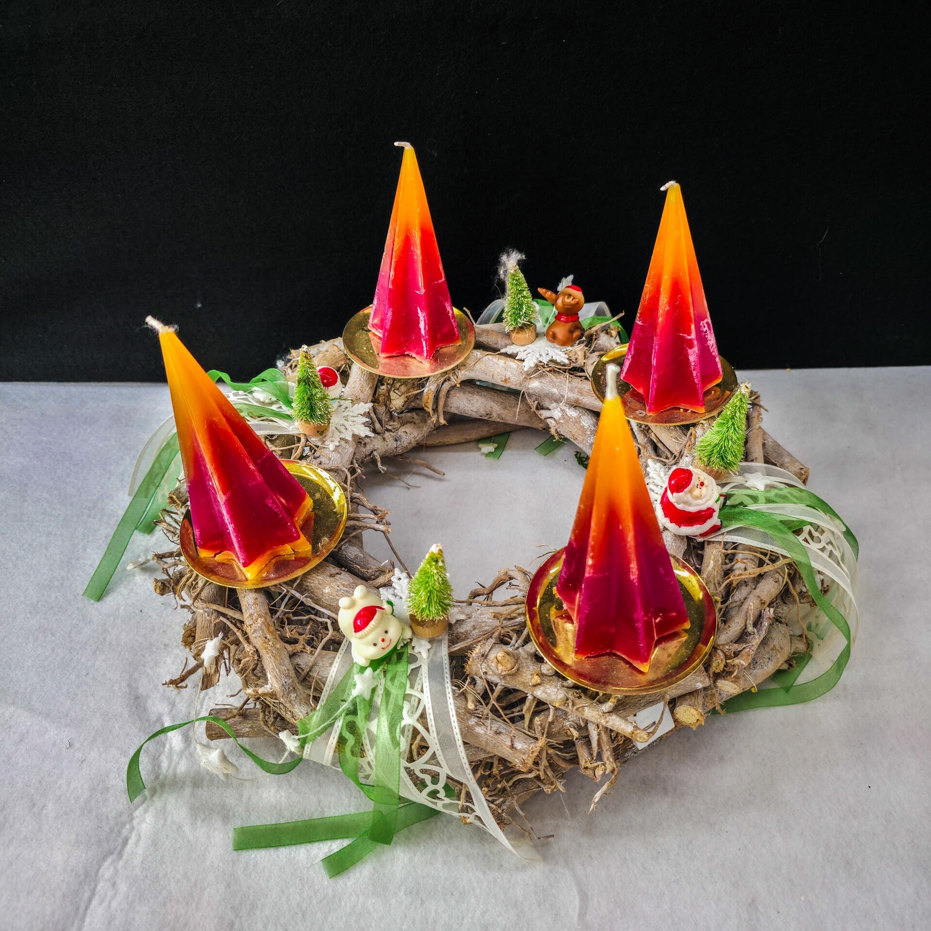 Ein Kranz voller Wärme und Farbe – die rot-goldenen Baumkerzen erinnern an flackerndes Kaminlicht.