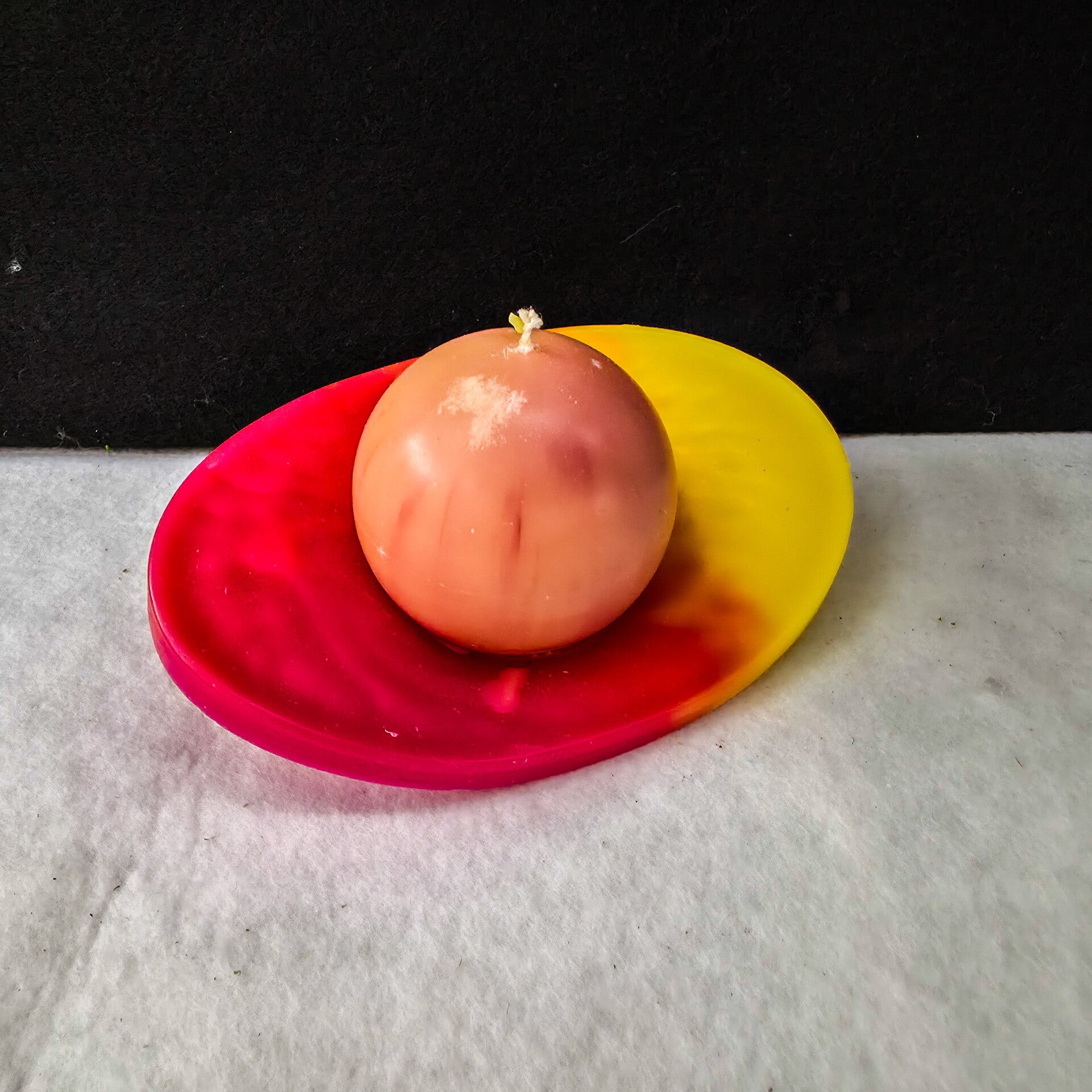 Strahlend wie ein Sommermorgen: Diese runde Kerze auf leuchtend roter und gelber Basis verzaubert durch ihre harmonische Farbgebung.