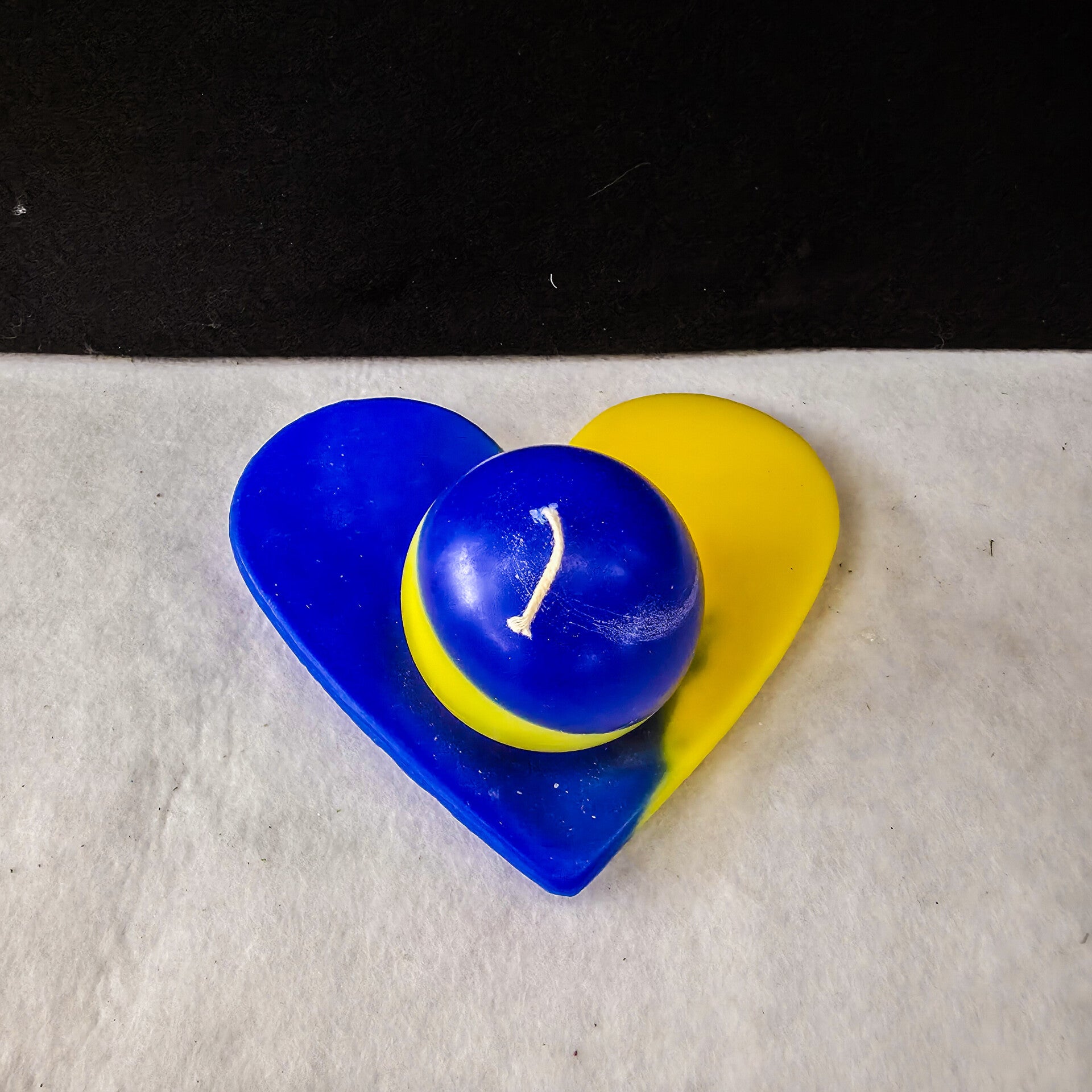 Zwei Farben, ein Symbol: Diese blau-gelbe Herzkerze steht für Hoffnung, Zusammenhalt und Frieden.