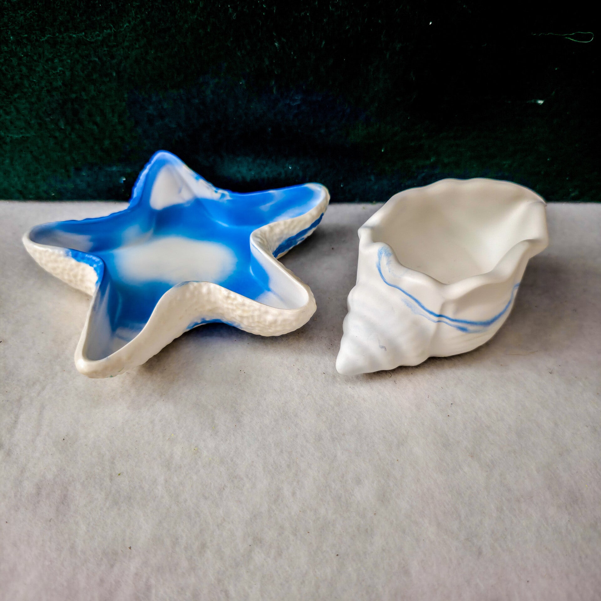 Dieses traumhafte Duo – bestehend aus einem blauen Seestern und einer filigranen Muschel – bringt den Zauber des Meeres direkt zu dir nach Hause.
