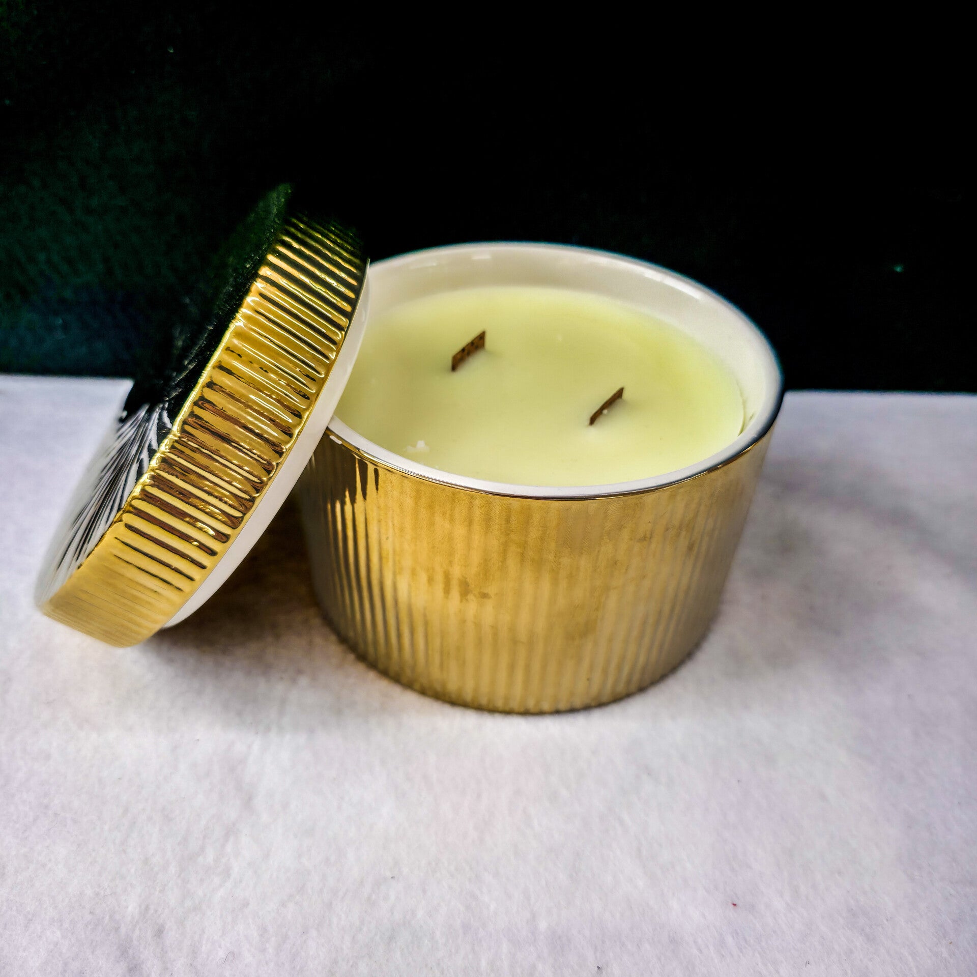 Eine elegante Kerze mit goldenem Glanz – perfekt für stilvolle Wohnräume.