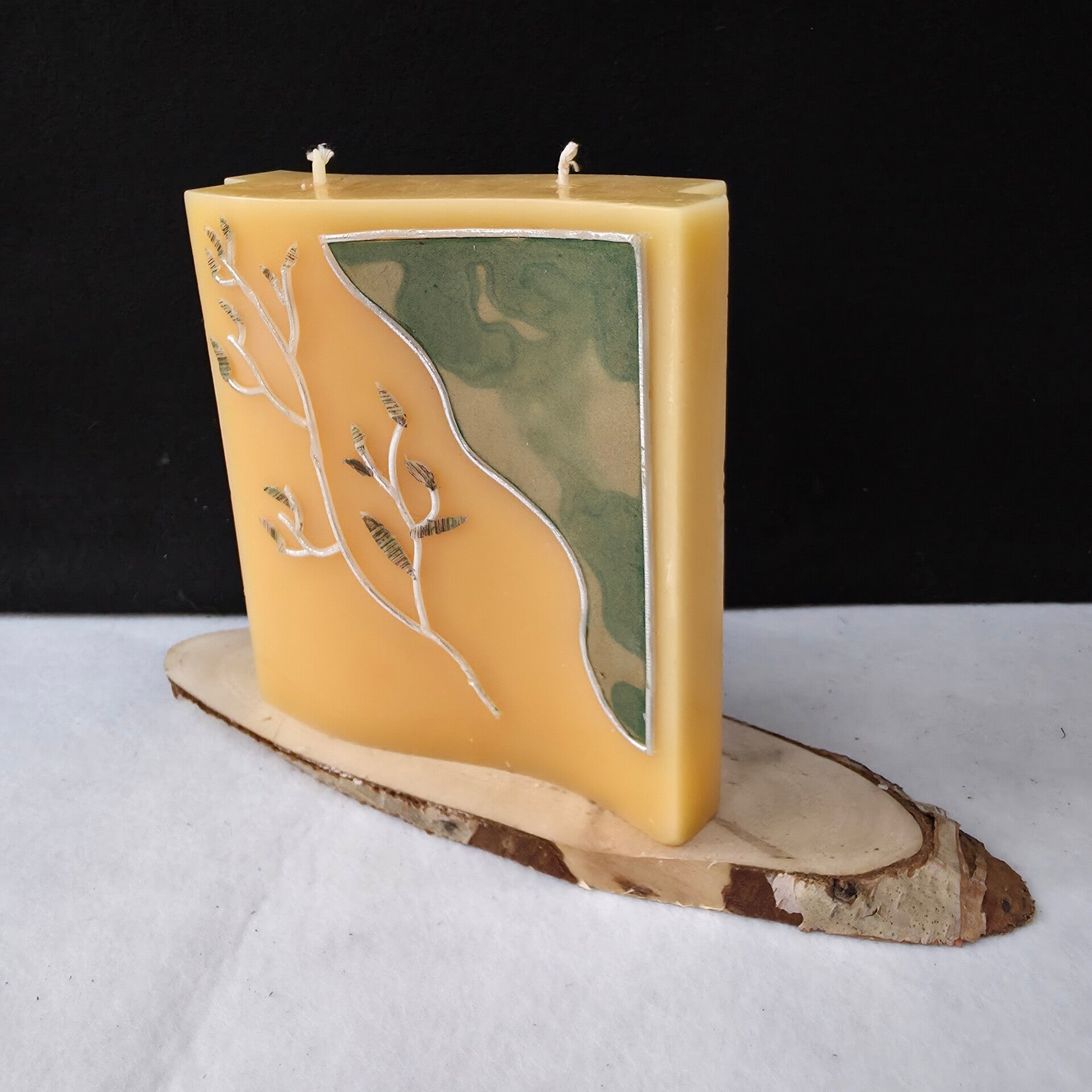 Diese goldgelbe Kerze mit feinen grünen Akzenten und filigranem Zweigmotiv steht für Harmonie und Naturverbundenheit.