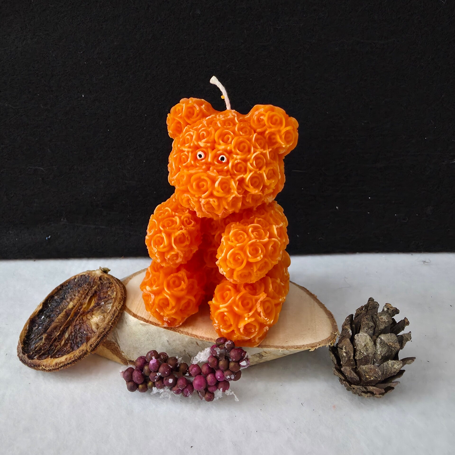 Ein leuchtend orangefarbener Teddybär aus Wachsrosen – verspielt, fröhlich und liebevoll gestaltet.