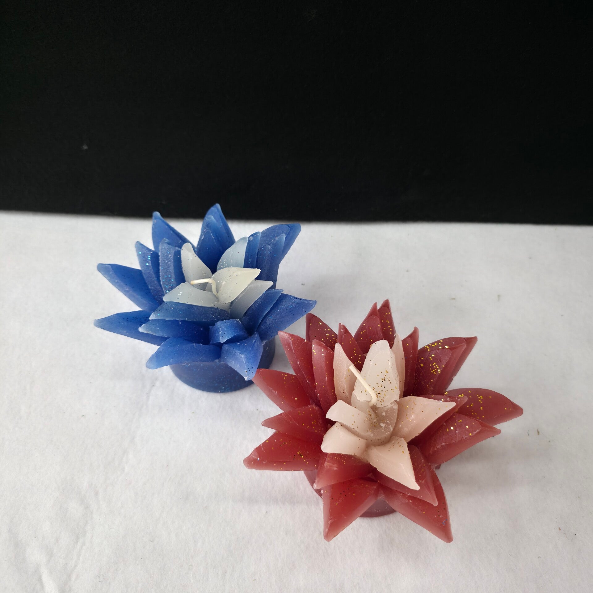 Zwei kunstvoll gearbeitete Lotusblüten-Kerzen in Blau und Rot mit feinem Glitzer – ein Symbol für Ruhe und Harmonie.