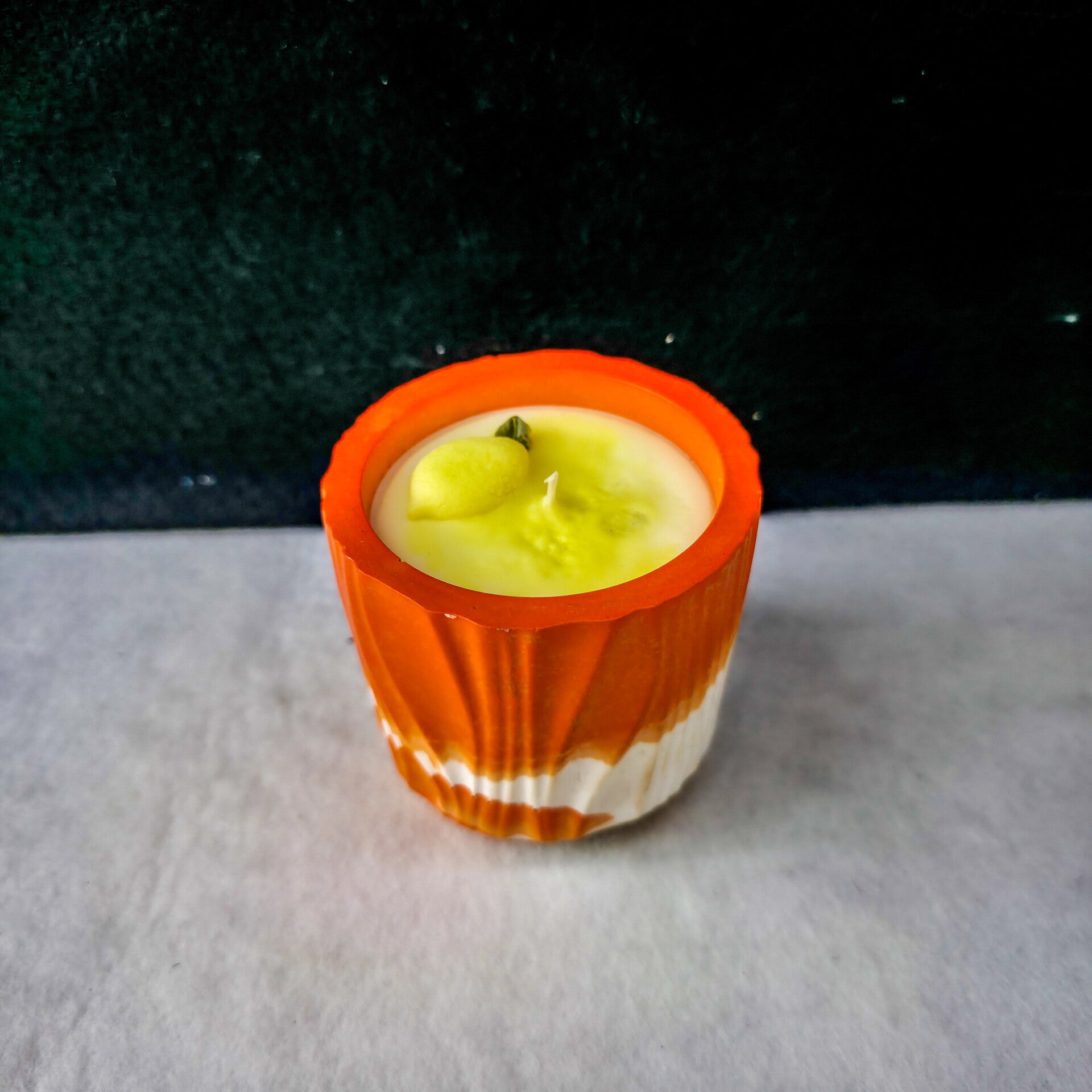 Ein frisches, orange-weißes Keramikgefäß mit gelber Duftkerze und kleinen Zitronendetails.