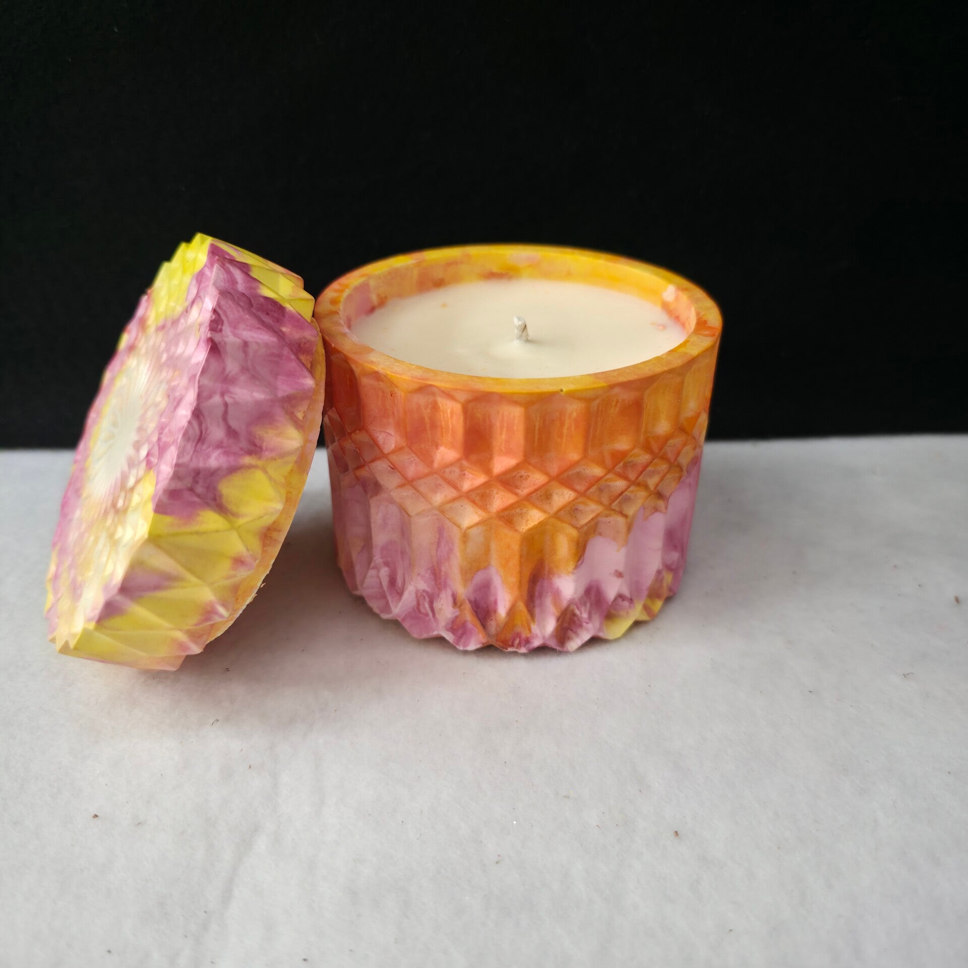 Diese farbenfrohe Kerze im Keramikglas mit Deckel erstrahlt in warmen Gelb-, Orange- und Rosatönen.