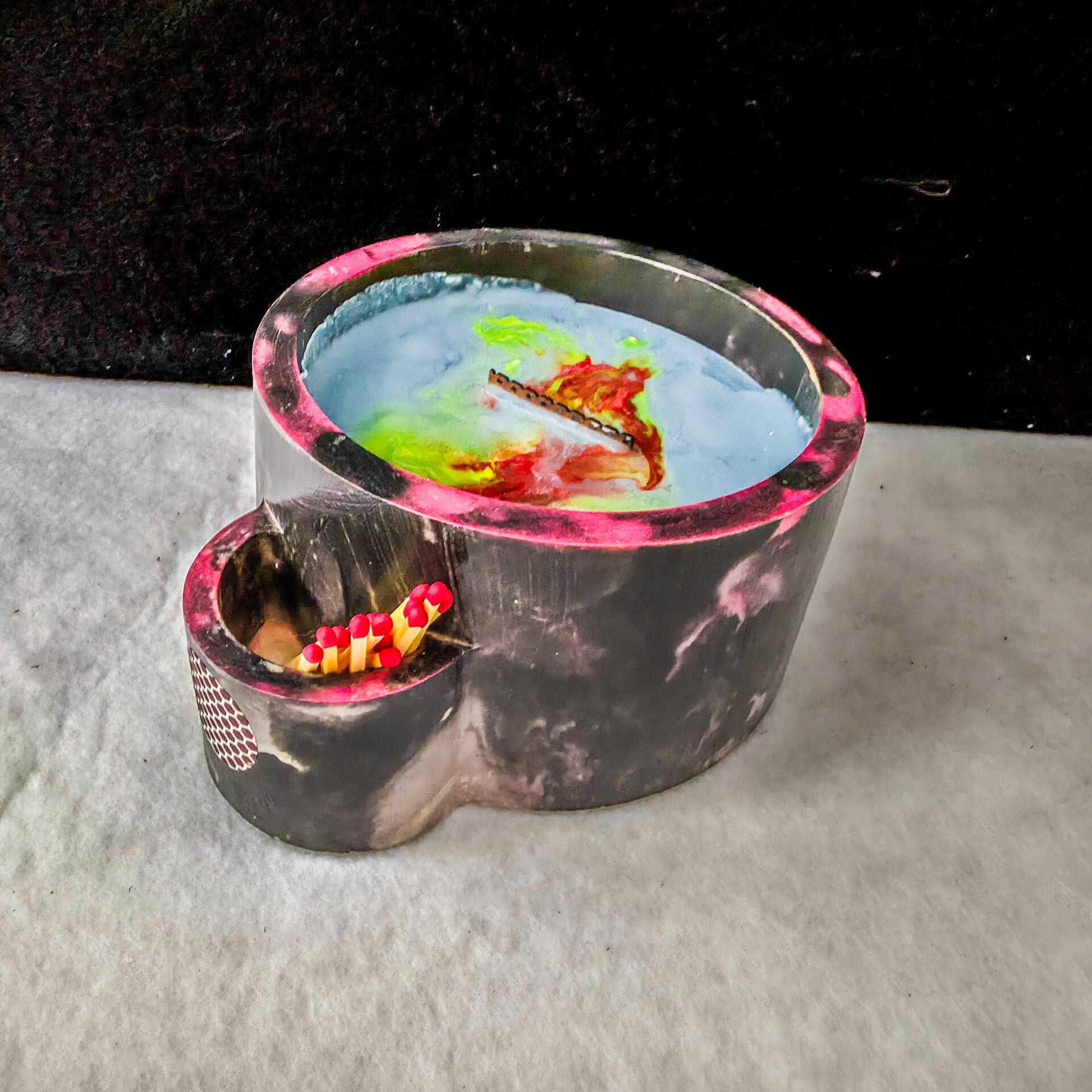 Dunkle Eleganz trifft auf feurige Farben – diese Kerze in Schwarz-Rosa mit Lavaeffekt bringt Wärme und Energie in jeden Raum.
