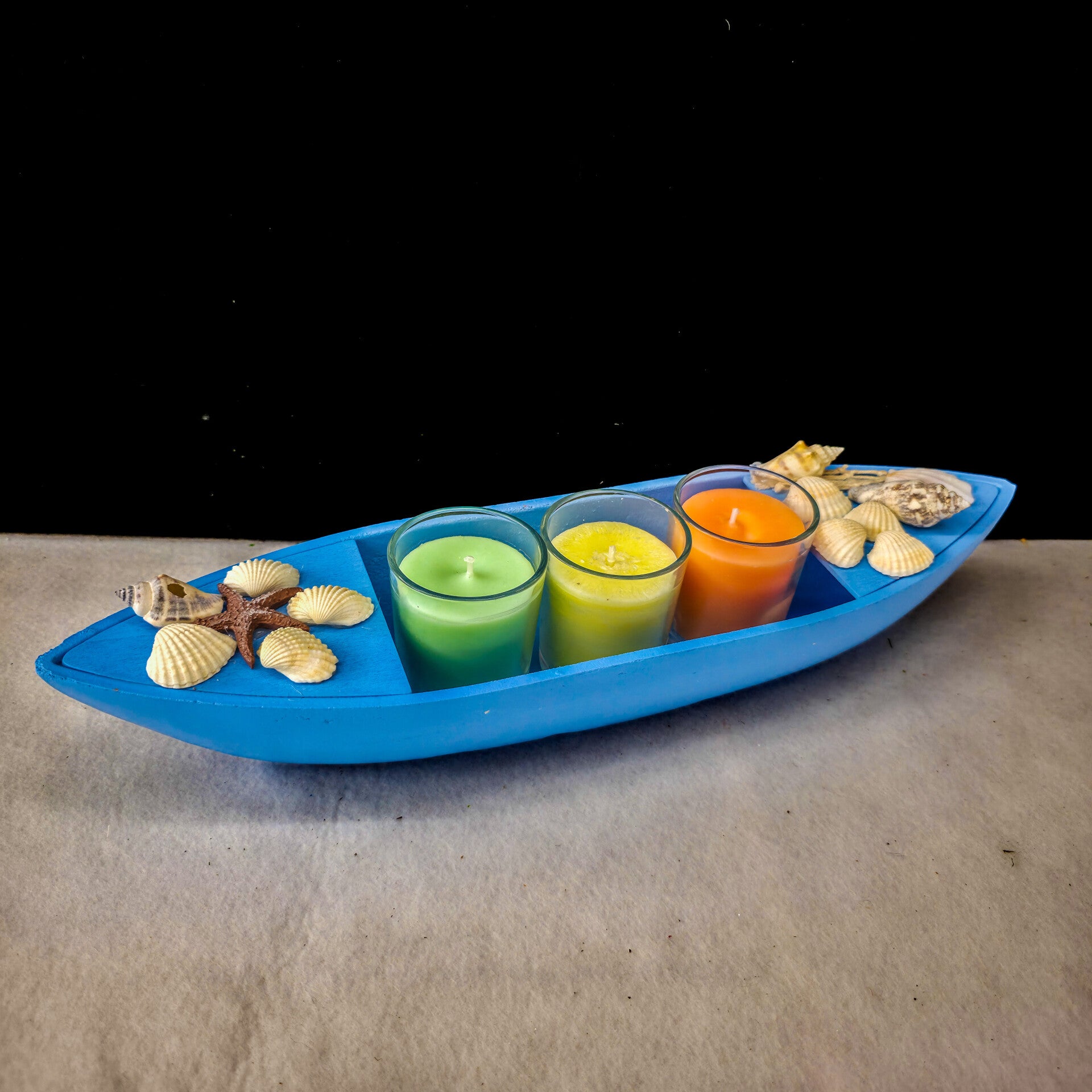 Ein handgefertigtes, blaues Holzboot mit drei bunten Glaskerzen in Grün, Gelb und Orange. Verziert mit echten Muscheln, Seesternen und Naturmaterialien, bringt dieses maritime Dekostück frisches Urlaubsfeeling in dein Zuhause. Ideal als sommerliches Tischhighlight oder liebevolles Geschenk für Meeresliebhaber.