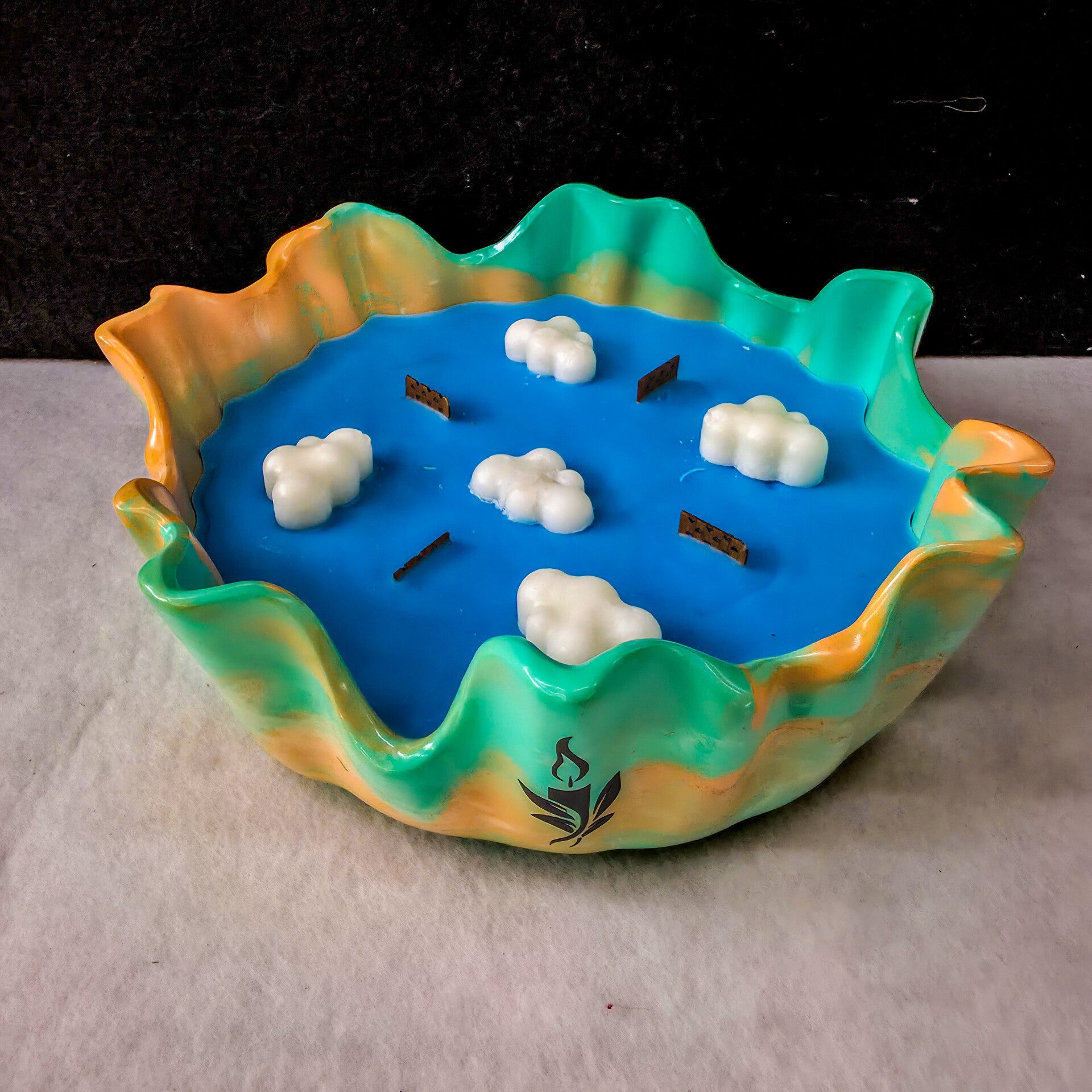 Eine atemberaubende Kerze, die an einen klaren Sommertag erinnert: leuchtend blauer Wachs mit kleinen weißen Wolken und vier Holzdochten, eingefasst in eine handgefertigte grün-gelbe Keramikschale.