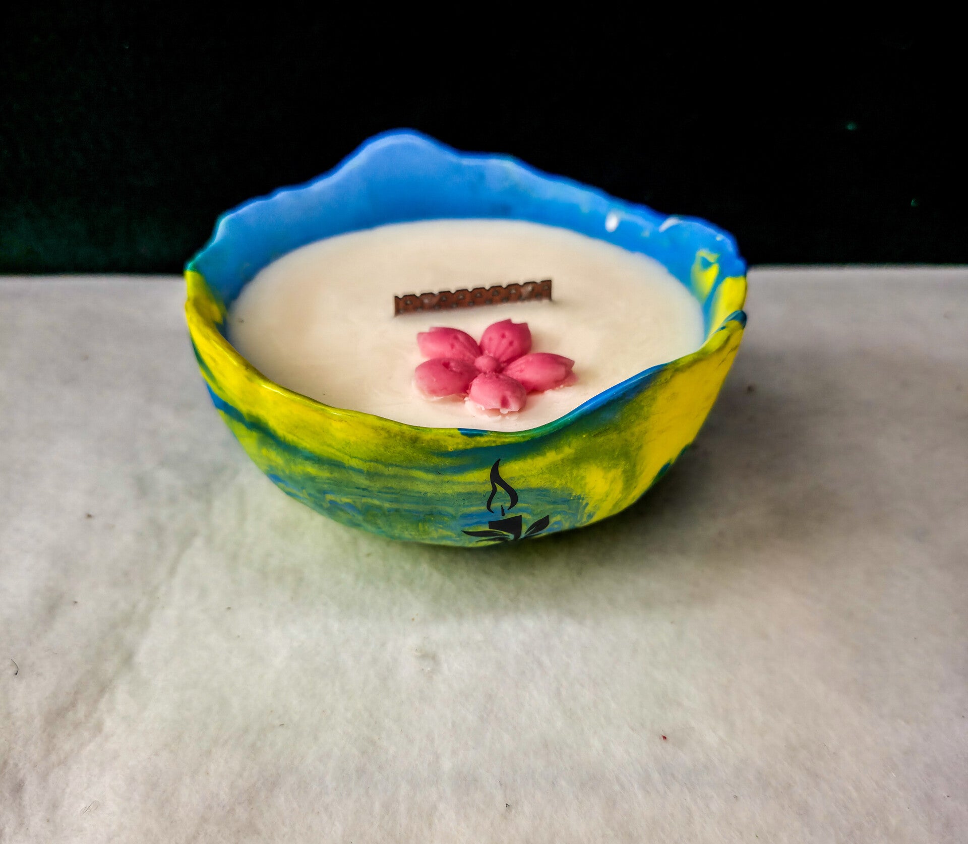 Ein Hauch Frühling im Glas: Zarte weiße Kerze mit rosafarbener Blüte, eingebettet in eine blau-gelb marmorierte Keramikschale.